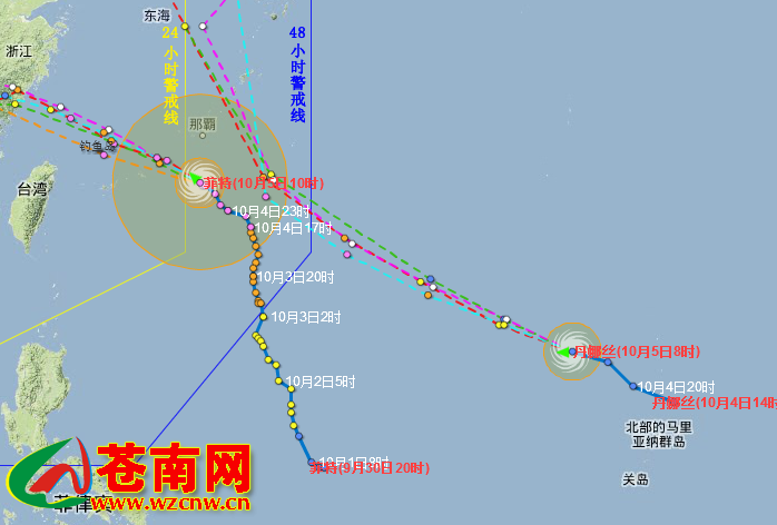 2013年第24号热带风暴丹娜丝(Danas) 时 间: 10月5日8时, 风 速: 23米/秒, 移 速: 25公里/小时, 东 经: 142.3°, 北 纬: 18.3°, 气 压: 990百帕, 近中心最大风力: 9级 2013年第23号强台风菲特(Fitow) 时 间: 10月5日10时, 风 速: 45米/秒, 移 速: 15公里/小时, 东 经: 127.6°, 北 纬: 24.5°, 气 压: 945百帕, 近中心最大风力: 14级